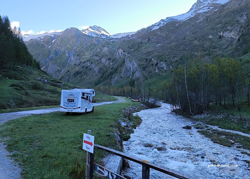 Parking balisé avec espace pour de nombreux véhicules à côté d'un chemin de terre, avec accès asphalté jusqu'à quelques mètres avant, et à côté de la rivière. Source d'eau potable et bien situé dans une haute vallée pour des excursions. Très calme et magnifique (en automne, seul. Reste de l'année je ne sais pas). Panneaux de danger pour les avalanches pendant les saisons de neige.