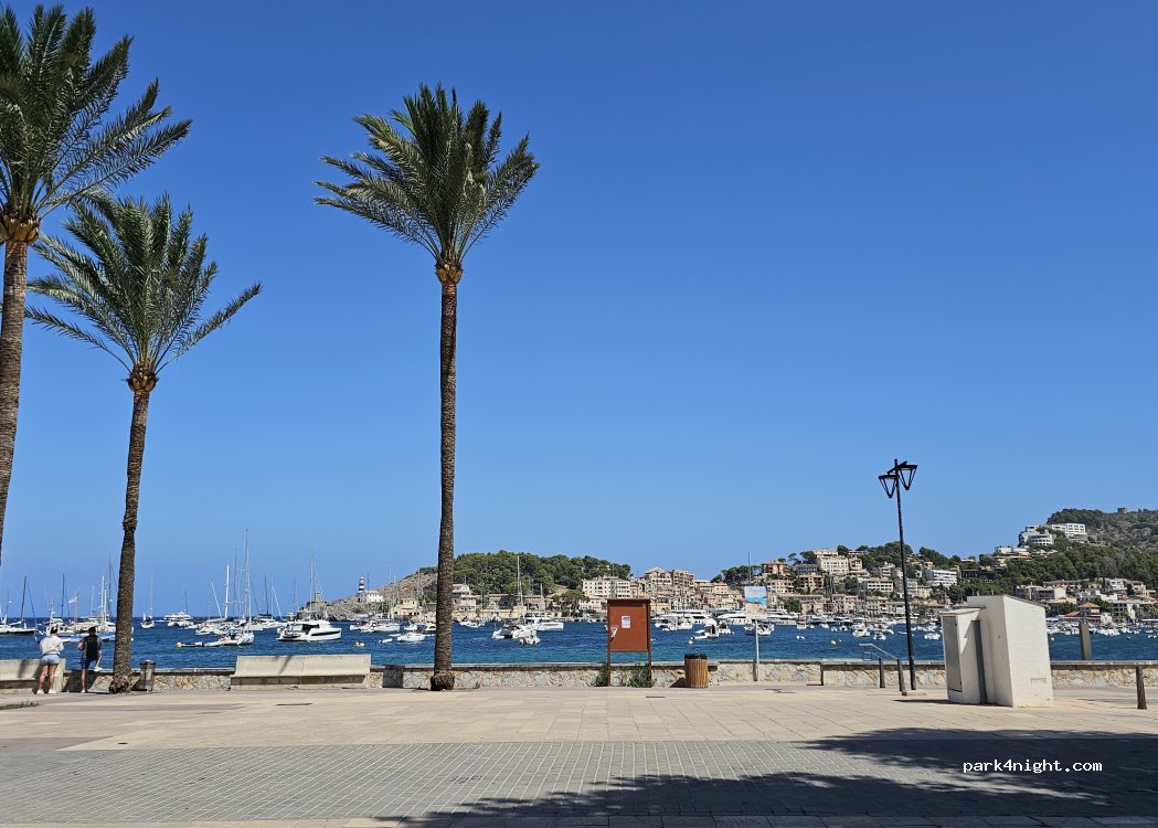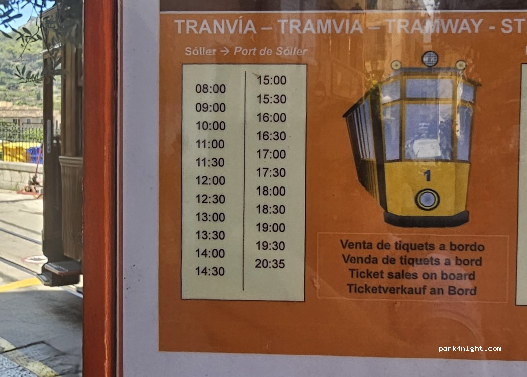 Parking de pago desde las 10:00 hasta las 19:00. La playa y la parada del tranvía de madera que te lleva al centro de Soller justo al lado. No tiene servicios pero muchos bares y sitio tranquilo para dormir