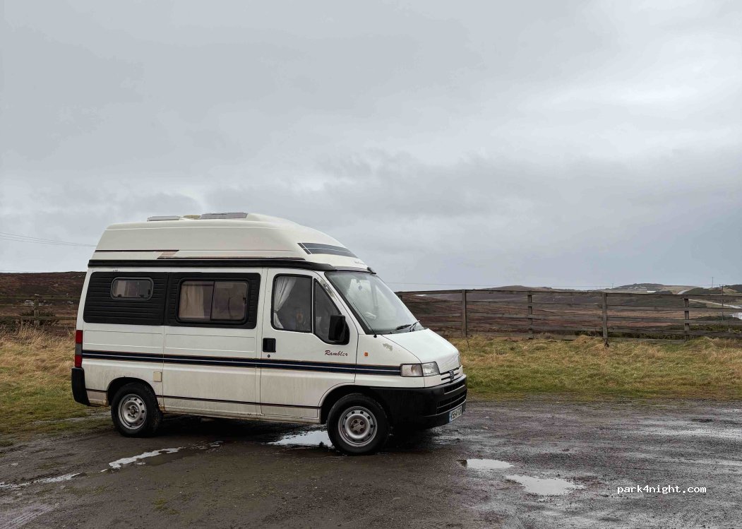 Lieu calme la nuit, place pour 4 fourgons/vans, mais attention à ne pas abuser: les locaux commencent à exprimer leur mécontentement en klaxonnant le matin. La cattle grid fait du bruit à partir de 6:00. Belle vue sur les lointaines Orcades.