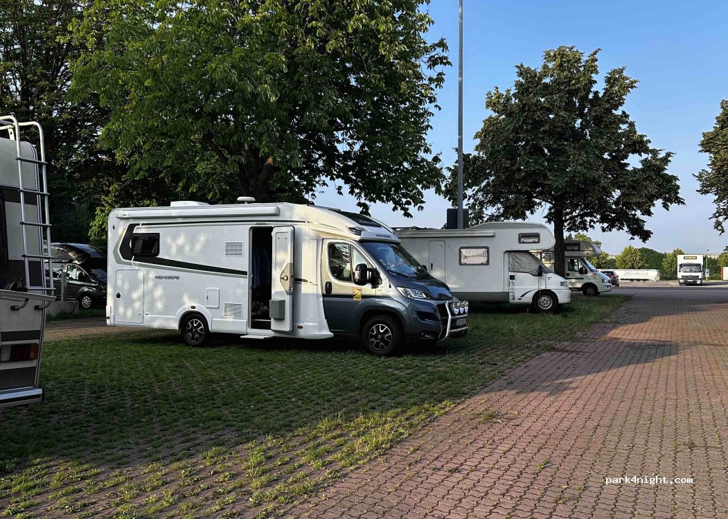 Riesiger P der auch als Festplatz genutzt wird. Vorderer Bereich unter Bäumen mit Stromversorgung und Ver- und Entsorgungsstelle. Wasserentnahme nicht getestet. 5 €/24 Std. Bezahlen auch mit Karte an Säulen. 400 Meter bis zum schönen Innenstadt erreichen mit großer Fußgängerzone Wir waren 4 Tage hier alles Bestens.