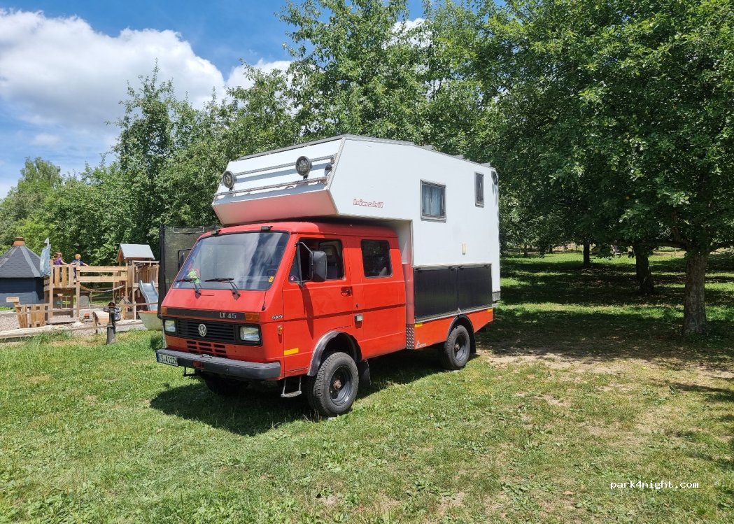 Short-term parking spaces for self-sufficient mobile homes and caravans between fruit trees. The slope of the parking spaces is more than compensated for by the wedges, kindness and helpfulness of the host family. Eggs, pasta, cheese, (grilled) meat and many fruit products can be purchased in the farm shop. In the village (350m) there is a village shop with bread rolls and an organic supermarket.