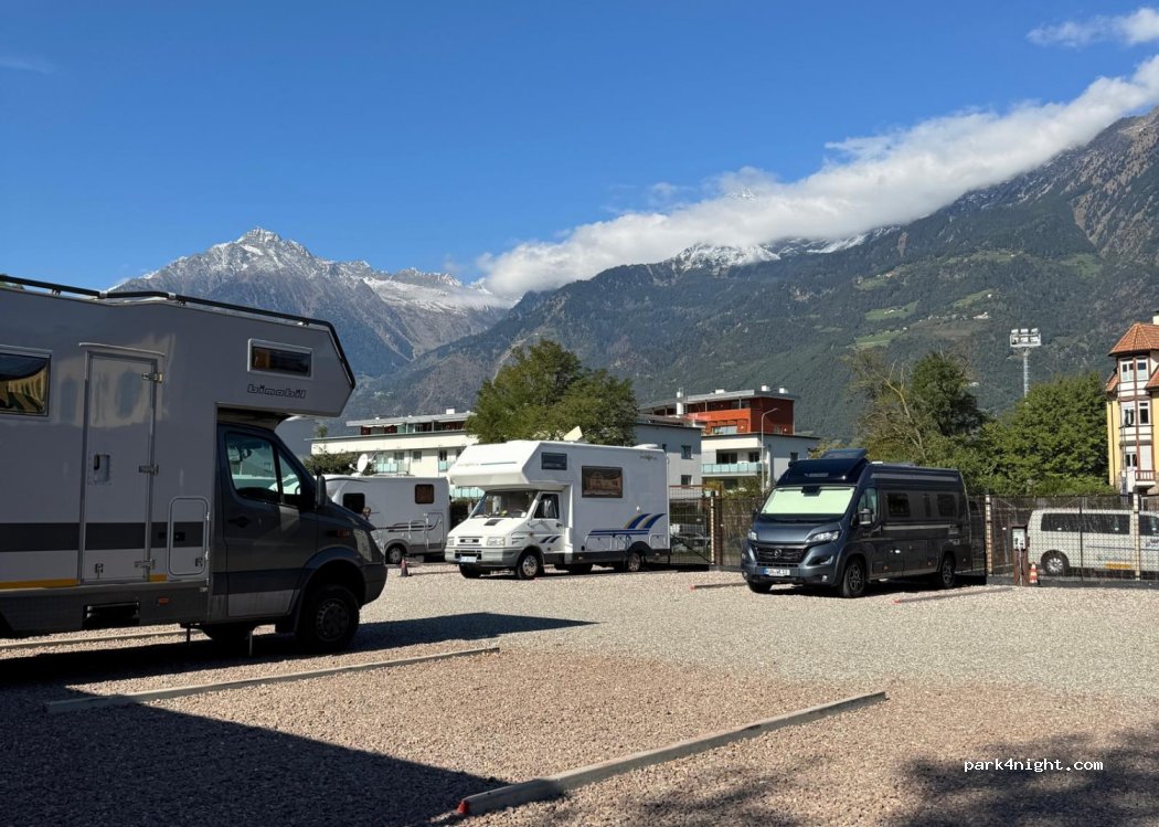 L'aire de stationnement pour camping-cars Merano, ouverte toute l'année.