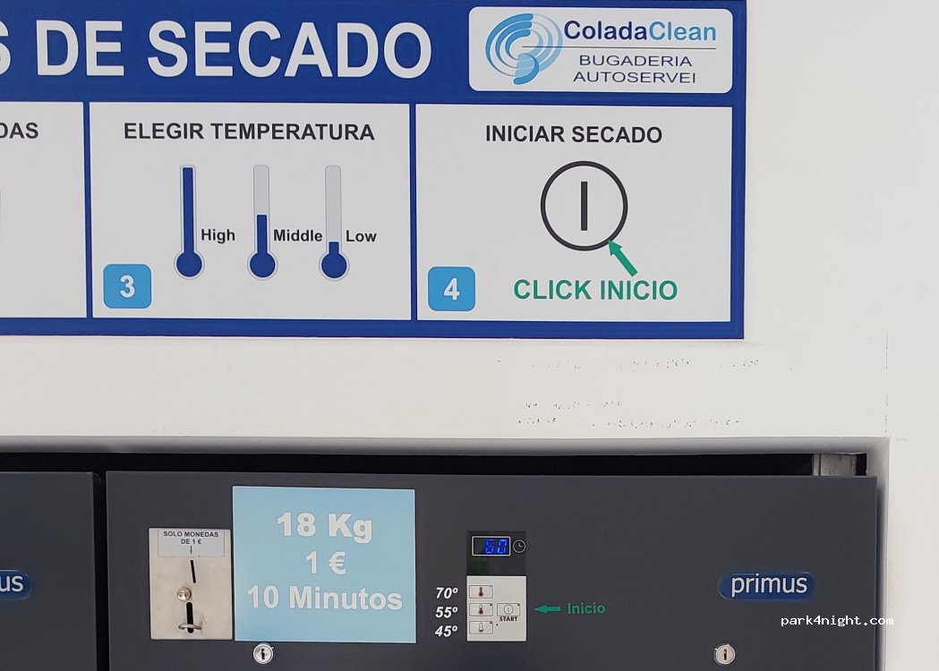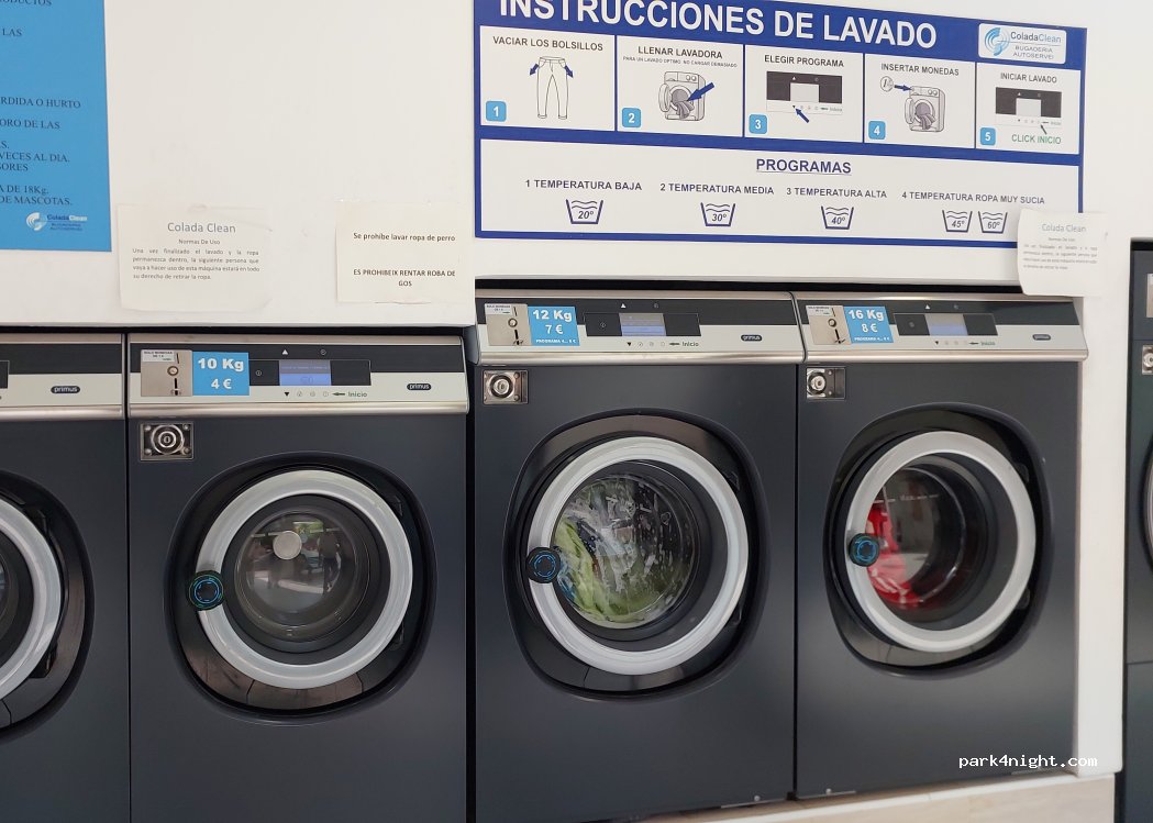 LAVANDERÍA La relación calidad-precio de esta lavandería es realmente muy buena. 2 euros por 20 minutos de secador es realmente genial!?? Todas (2 lavadoras de 10 kg / 1 WM de 12 kg 1 WM de 16 kg / 2 secadoras de 18 kg) se ajustan directamente a la máquina. Solo funciona con monedas de 1 EUR. Hay una máquina en la pared que cambia billetes. El detergente está incluido. No puede agregar su propio detergente. Pero huele moderado. No demasiado duro.