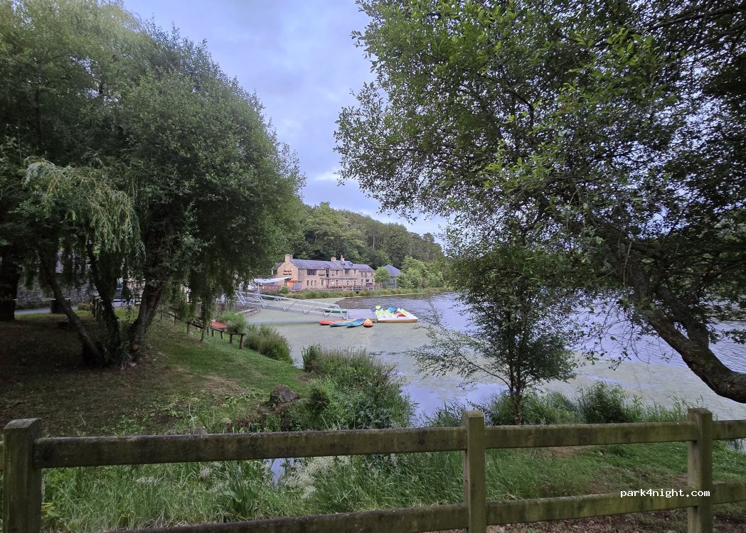 09/06/24 plenty of level parking, bins and grass/shade at edges. Well lit all night and after the cars had left (some not until 23:00) we were one of only 4 vans in total. Very quiet, only the stream to be heard. Easy access to walk up to the village or around the lake. Best ever Kouign Amman from Kouign Amman Far Breton’ just on the main square opposite the creperie