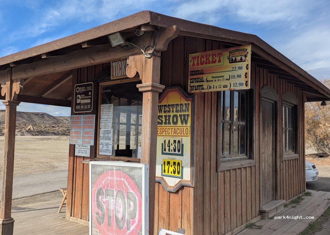 Show à 14 h et 17:30 dans le saloon, mais en espagnol, chiens admis dans Fort Bravo mais mes miens ont eu grand peur des balles à blanc. Eau disponible ( tuyau près des chevaux ) , vidange à la station service de Tabernas. Joli cadre sous le soleil, il faut monter à pied derrière le village pour la vue. Nuit sans un seul bruit !