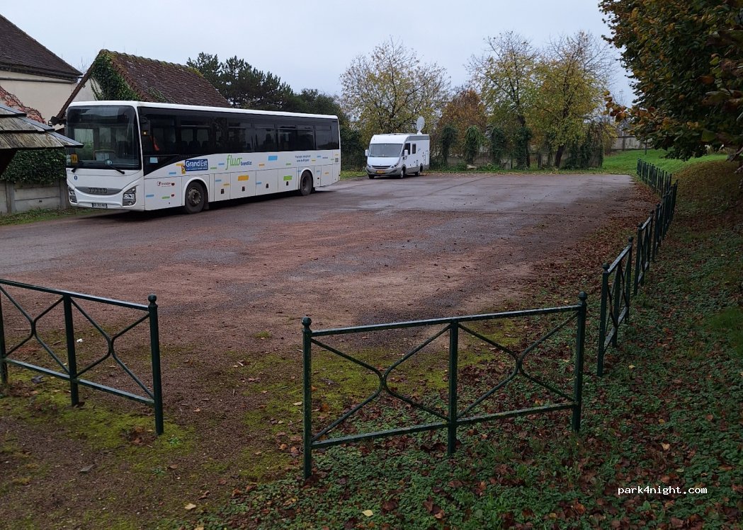 Prévoir la place pour laisser manœuvrer le bus scolaire et le camion ramassage poubelles vers 5h30 le mercredi. Éviter de boucher l’accès aux deux bornes de recharge. En conclusion au fond de la place c’est le mieux car près du kiosque se rassemble le covoiturage.Sinon pour une nuit en transit c’est bon avec terrain plat et goudronné