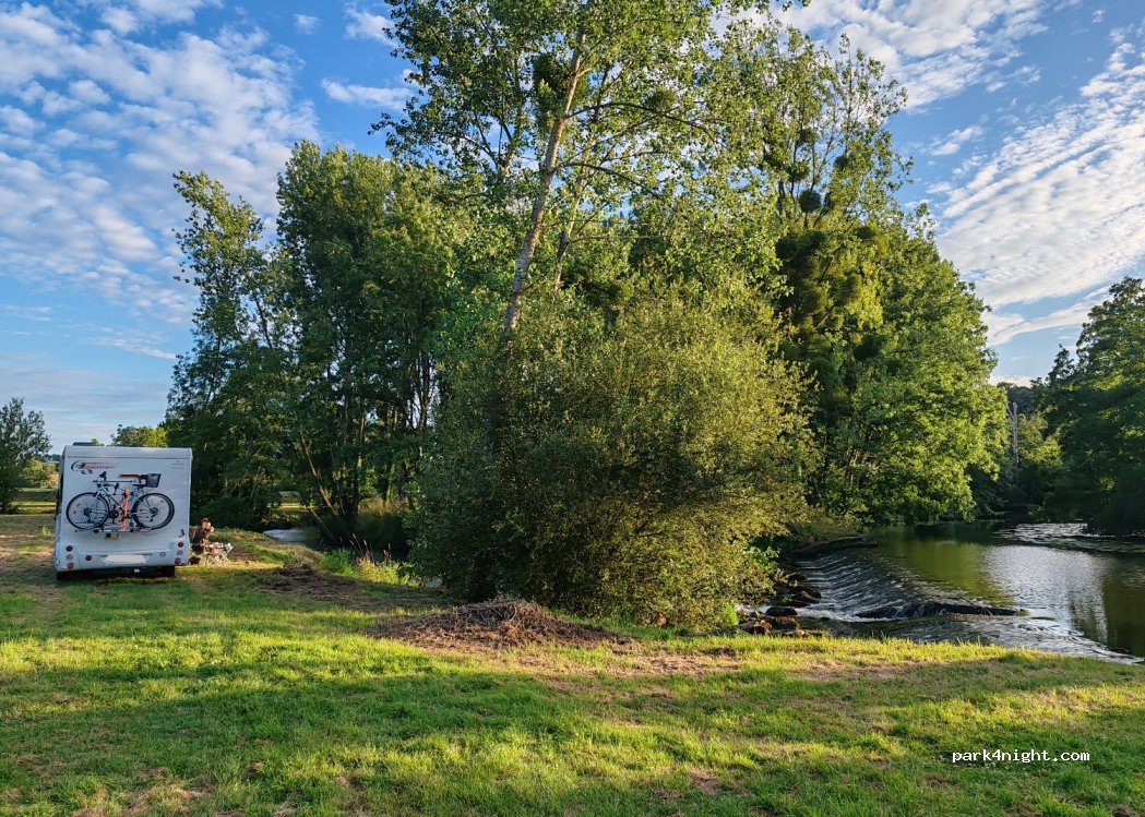 Grand espace (plusieurs véhicules possible) en pleine nature au bord d'une cascade sur les rives de la Mayenne. Au top ! Très calme et tranquille, en cette fin avril, avec le bruit apaisant de la cascade. Juste la nature, le calme et la rivière (pas de services, pas de WC, pas de point d'eau potable).