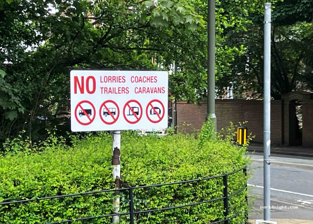 Parkplatz in der Nähe der Innenstadt. Sehr enge Wege zwischen den einzelnen Parkbereichen. Daher die Verbote. 7 m Wohnmobil kein Problem. Guter Pub ganz in der Nähe.