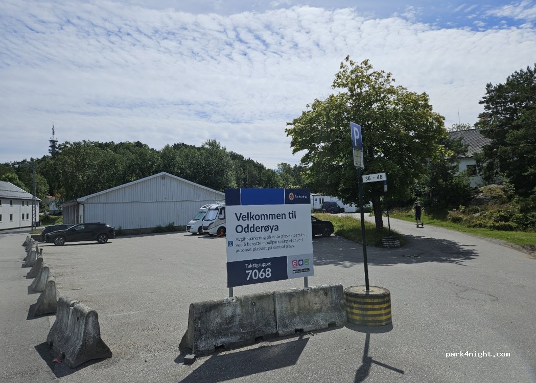 Open now, NOK 25/hour. Perfekt location for exploring dockside of city. Nice area. We stayed here one night to take the early ferry to Denmark. I read somewhere that it was ok to stay directly in line for the ferry overnight, but I think it has been forbidden now due to a major construction change. Then this location at Odderøya is perfekt, just a 5 minutes drive to Colorline ferry in the morning.
