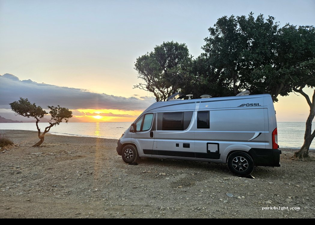 Plage sans fin avec de belles vues et de nombreuses options pour garer un camping-car. Si vous venez de Plakias, mieux vaut avoir un 4x4, la route est assez accidentée par endroits. Étonnamment, il y a deux belles tavernes, fréquentées principalement par des Grecs pour le déjeuner du dimanche, sinon vous serez complètement en pleine nature. Silencieux. Plage mélange de sable et de rochers.