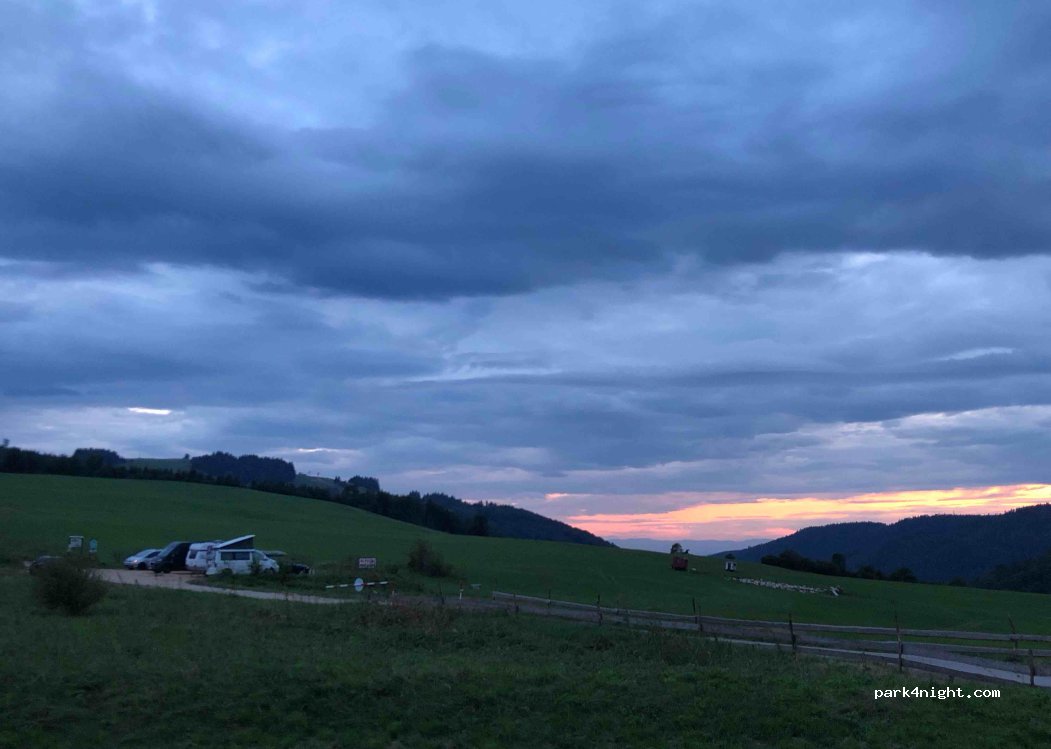 Stayed here two nights with no problem. Beautiful spot with a view of the mountains and sunset, can walk ten mins up the hill to a bench for a better view. A little uneven but not an issue, locals came in the eve for walks but quiet at night. There was an open barrier before the car park, may be closed sometimes but fine to park atm. A 15min drive from start of Chopock/Dumbier hike in low tatras.