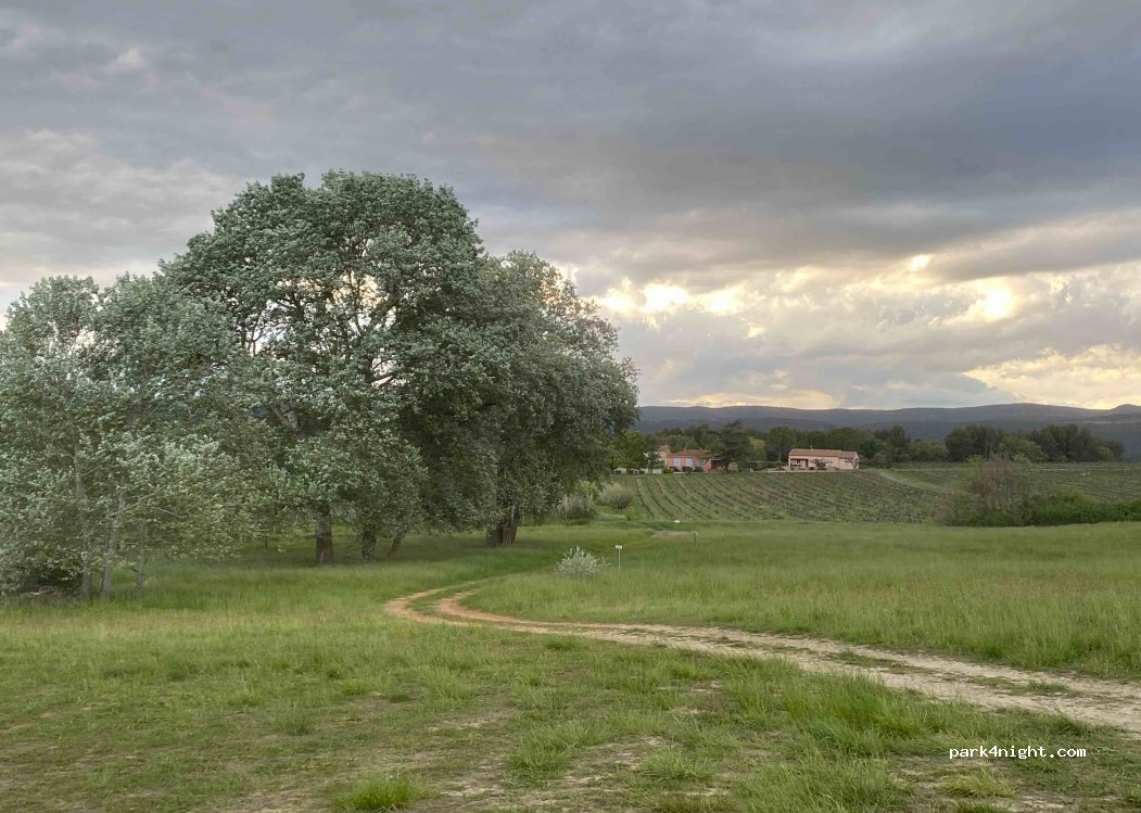 ‼️‼️‼️Don’t take the small road coming from roussillion, if you don’t have a 4x4. It’s ment for walking… Google will send you this way any how, especially if you come from direction Gordes. Was very scratchy to drive with a t4‼️‼️‼️Take the big road instead Place is nice between winevines and in the shade underneath big trees.