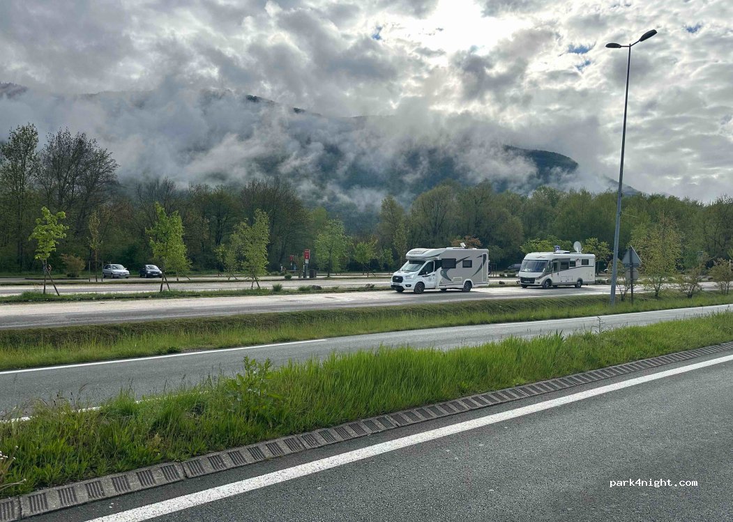 We ended up here as there was no parking in Annecy. In winter it is free and the section closest to the road has no height limit. You can walk to the lake from here. It is a food stop over for one night out of season.