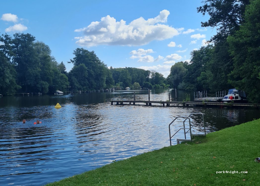 Den Parkplatz vom Strandcafe soll man möglichst während der Saison nicht nutzen, aber der Parkplatz vom Fußballplatz ist frei für WoMos, wenn es keine Spiele gibt. Perfekt auch am Wochenende, toller Einstieg zum Kajakfahren auf der Dahme. Wenn man im Café ein Eis ist, sind die Besitzer sehr freundlich!