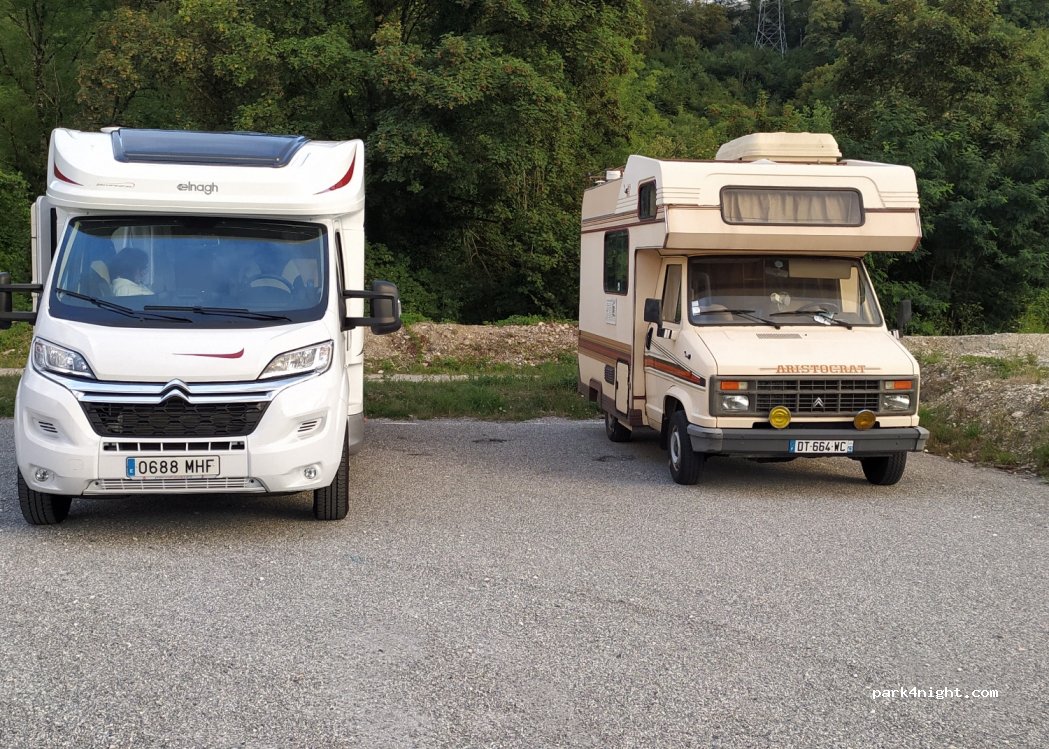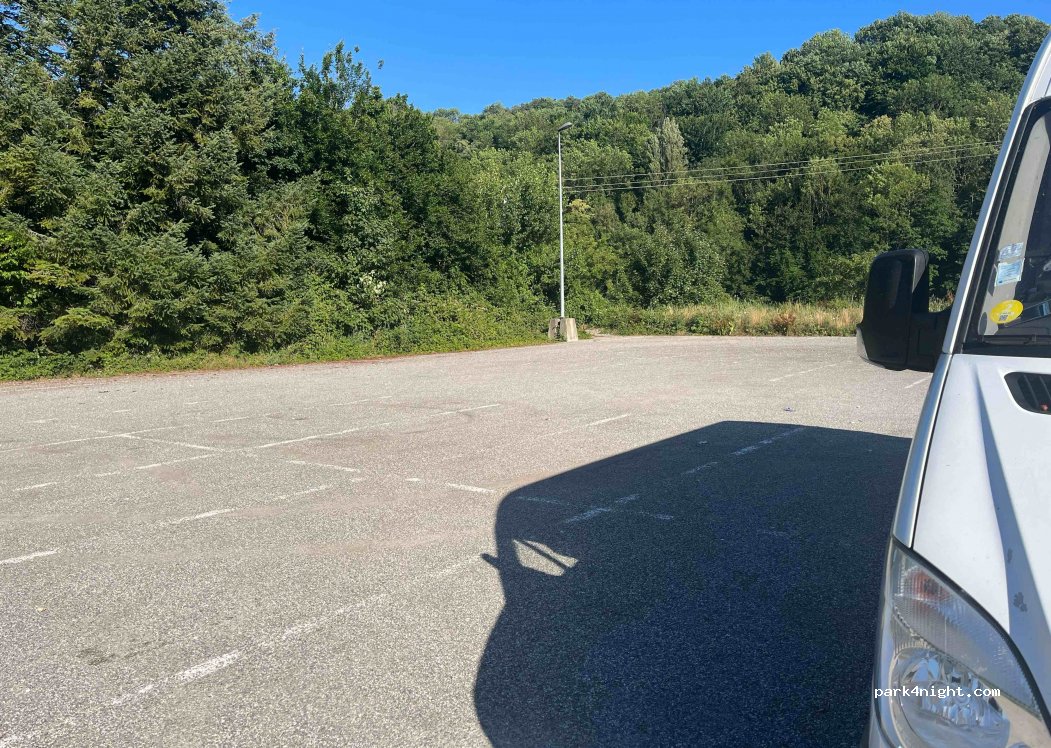 Large car park (70 pl.) without shade in the afternoon a few minutes walk from all amenities. I did not sleep there (but I think it is possible, although there is the nearby highway bridge and buildings). I was looking for a full 4G (Orange) place to work and something to stretch my legs on the side; found. From this car park, we follow the Rhône, then the Valserine and we come across a great swimming spot... it's worth the walk!