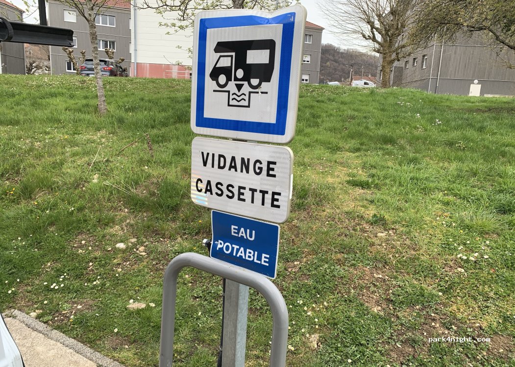 superbe endroit avec très belle vue sur la rivière. vidange eau grise, cassette et remplissage eau gratuit, même possibilité de brancher gratuitement à priori. Bravo à la commune et un grand merci pour nous avoir mis cet espace à disponibilité. Grâce à vous, nous avons fais marcher les commerces qui sont très proche. Produit de grande qualité à la boucherie