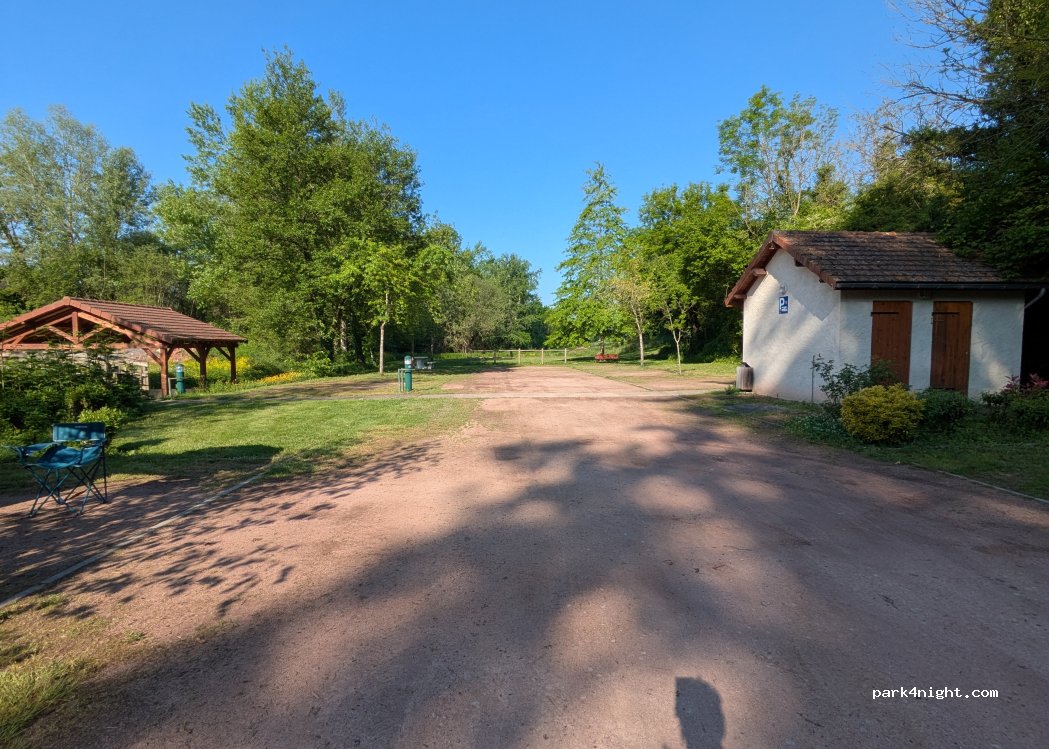 Terrain propre et plat, wc à coter ancien lavoire en face assez mignon. Idéal pour s'arrêter sur un trajet de vacance. National pas loin on entend les camions la nuit c'est dommage.