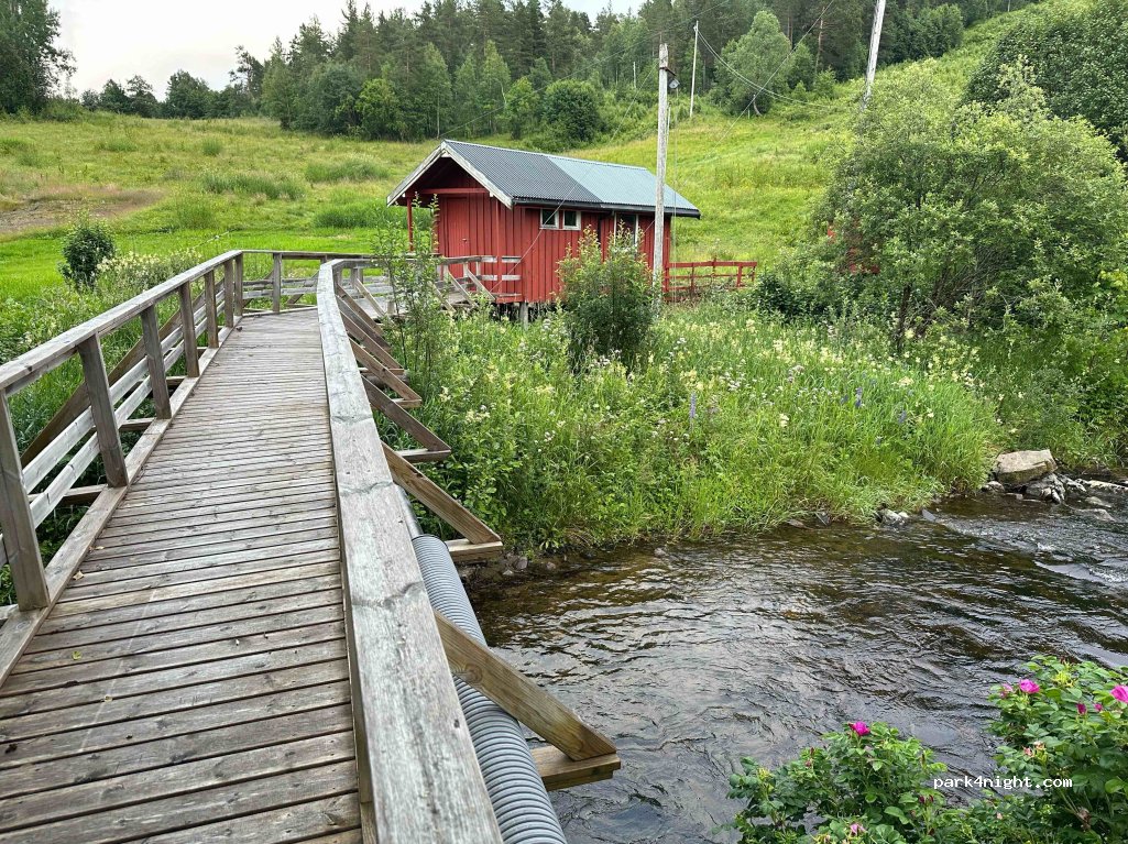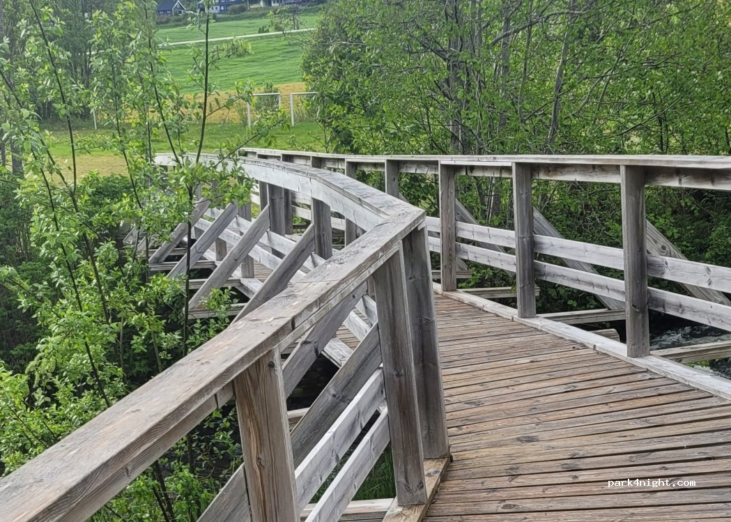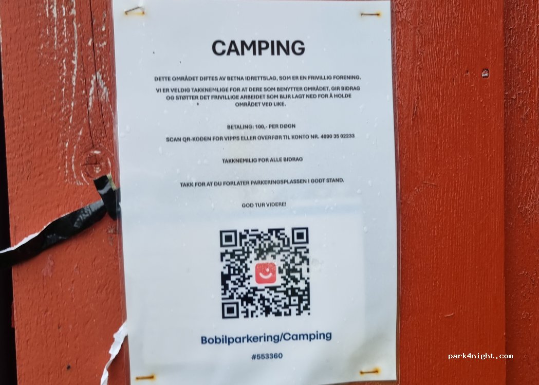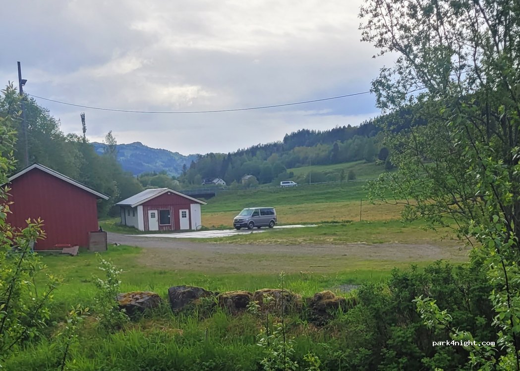 An einem Fußballplatz nahe der Straße, direkt an einem Bach, super für 1 Nacht. Asphaltplatz, trotz Nähe zur Straße sehr ruhig. Super auch für Hunde. Eine Spende an den Sportverein von 100 NOK wird erbeten.