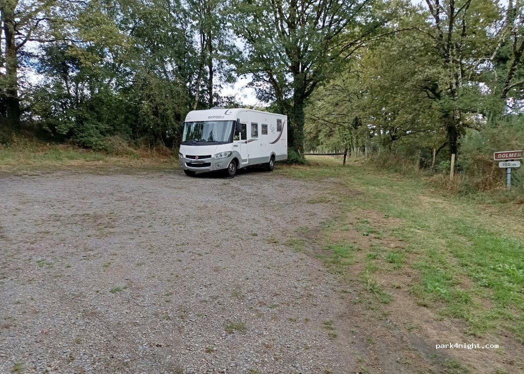 Sur le bord d’une petite route très peu passante, petit parking permettant la visite d’un dolmen, stationnement 3véhicules, pas très plat mais possible. Lieu pour une petite halte à midi, se reposer, dormir une nuit dans un petit coin tranquille.