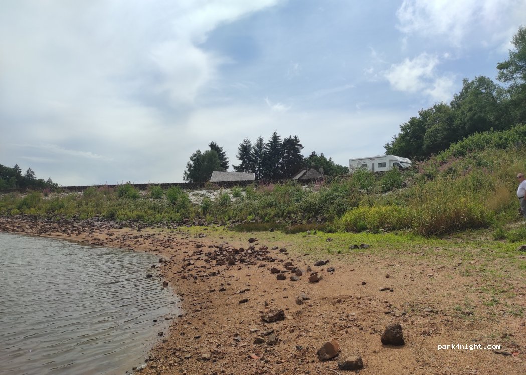 Facile d'accès, plat, calme, et très belle vue sur le lac. La plage est accessible par un petit talus assez facilement. Coucher et lever de soleil magnifique. Demi-tour possible pour repartir (avec Camping Car 6,65m).