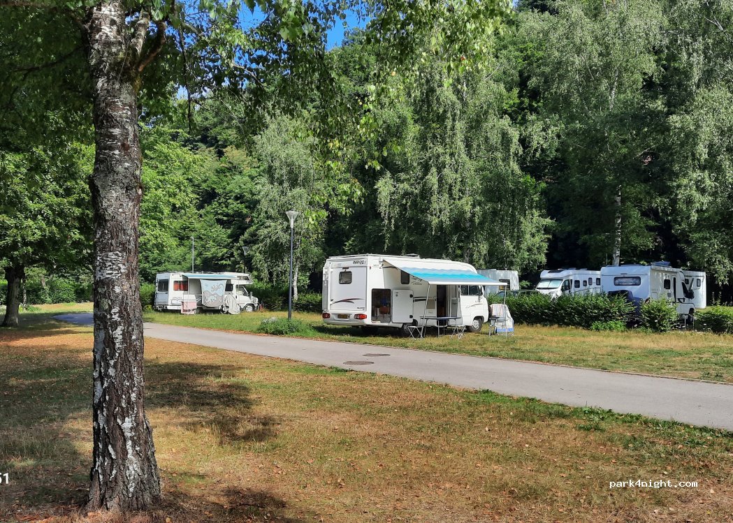 Nueva zona (2016) para autocaravanas con capacidad para unos cuarenta vehículos. El precio del parking (pago con tarjeta de crédito) incluye electricidad, desagüe de aguas residuales y cassette, agua potable y wifi.Agradable entorno arbolado, cerca del río. Cerca del centro de la ciudad y de todas las tiendas, piscina, bolera, pista de tenis.
