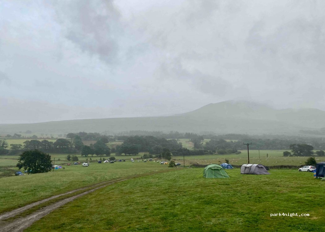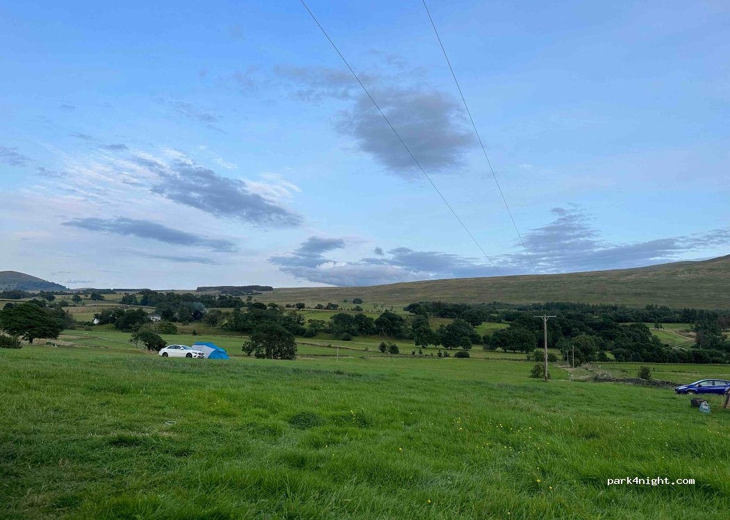 Grande prairie au placement libre. En arrivant, installez vous, le propriétaire est passé nous voir vers 19h pour le paiement. Attention le terrain est en pente. Douches et toilettes et éviers dans une grange de l’autre côté de la ferme. 18£ pour 2 personnes et une voiture. Beaux paysages.