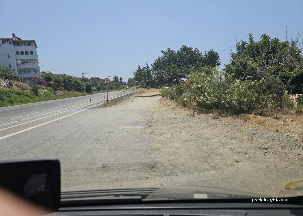 Au bord de la route, sous un arbre endroit très calme. Comme c'est sur une ancienne route (Alanya à Mersin), peu de véhicules passent, très calme. Superbe coucher de soleil. Aucun service aux alentours. Il y a une plage juste sous le parking. Plage de sable, fond rocheux mais très agréable à nager. Spot n'est disponible que pour une personne.