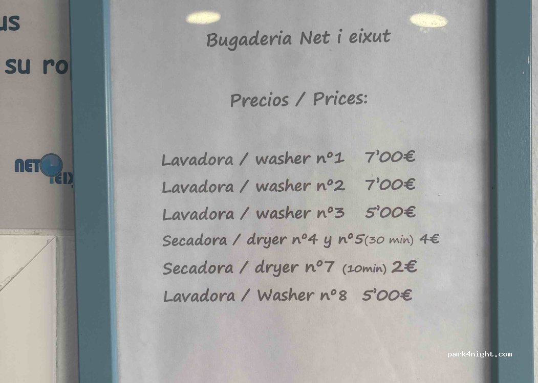 2 grandes machines (7euros) et 2 petites (5euros) avec plusieurs programmes de lavage. 2 grands sèches linges (4euros) et un petit mais qui ne fonctionne pas (2euros).