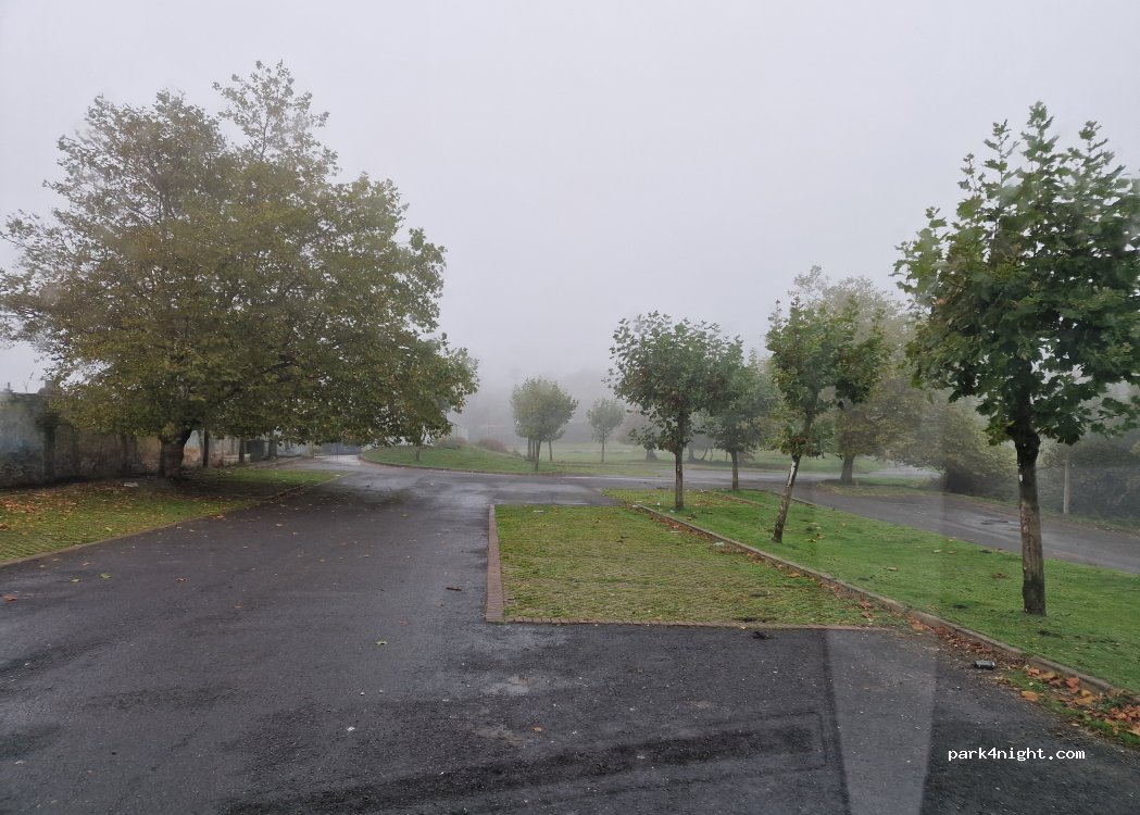 Cemetery car park, in the heights, giving a breathtaking view of Bilbao. Our old combi really gave everything to get there! Quiet, lateral green space for dogs, large and numerous places that can accommodate all types of vehicles, well motorized. Very peaceful night.
