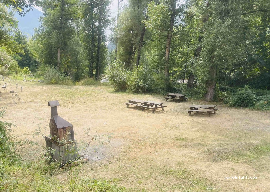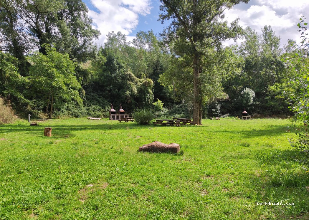 Muchos lugares en la hierba. justo debajo, hay que bajar unos escalones. Amplio merendero a la sombra con muchas mesas y grandes barbacoas. río limpio y tranquilo para la tormenta. 30 cm de profundidad como máximo en este momento.