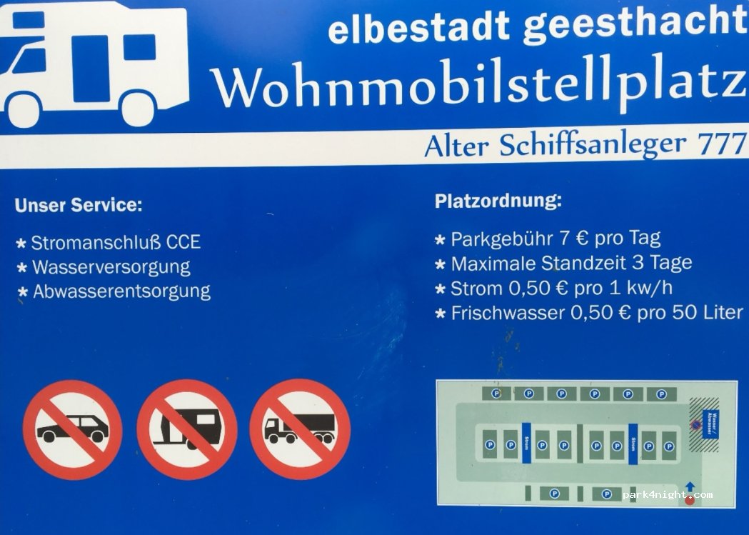 Ein Parkplatz befindet sich am Elbufer, in der Nähe des Freibades. Die Straße direkt hinter dem Campingplatz ist daher etwas laut. Die Altstadt ist zu Fuß in ca. 15 Minuten zu erreichen. Der Wohnmobilstellplatz „Alter Schiffsanleger 777“ liegt direkt am Elbufer. Abstellen, Motor abstellen, gucken, beobachten und genießen. Das muntere Kommen und Gehen der großen Frachter und Sportboote bietet ein unvergessliches Schauspiel, besser als im Fernsehen. 300 Meter hinter dem Freibad gelegen, bietet er Platz für acht Fahrzeuge. Den Gästen stehen zwölf Stromanschlüsse sowie eine Wasser- und Abwasseranlage zur Verfügung. Maximalaufenthalt: 3 Nächte.