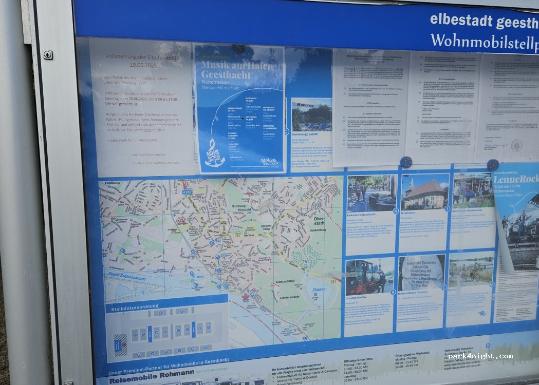 Située au bord de l’Elbe et d’une route, cette aire est idéale pour un court séjour ou pour une étape lors d’un voyage. Les personnes au sommeil léger pourront être gênées par le bruit de la route mais c’est supportable. Ce désagrément est compensé par le prix très raisonnable de 7 euros pour 24 Heures (heure pour heure). En outre cette aire dispose de service. : eau, électricité, vidange eux noires et grises. Le paiement du stationnement s’effectue à une borne automatique (pièces et cb acceptés). Prévoir des pièces de 50 cts pour l’eau et l’électricité (50 cts par kw/h - payable directement sur les bornes électriques)