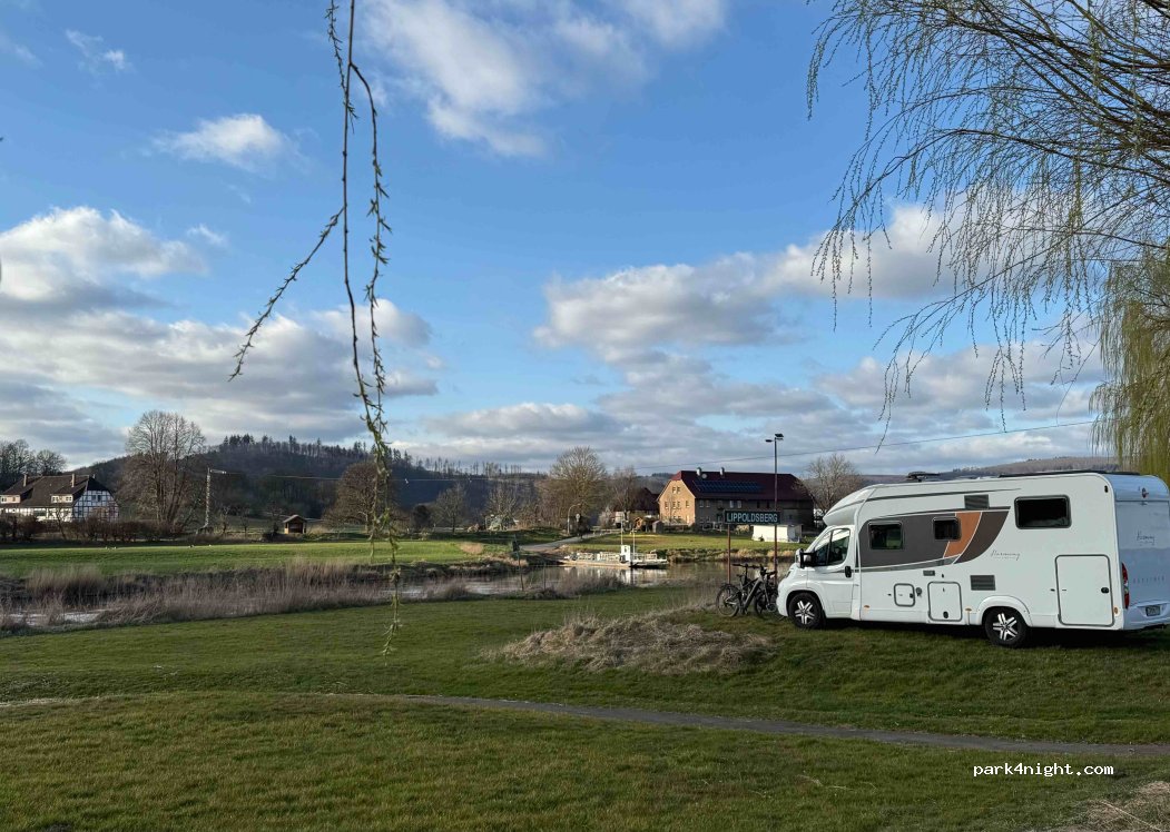 Aire de camping-car très agréable, en bordure de Weser. Terrain plat et herbeux. Emplacement pour 13€/nuit. Douches 2€ pour 3 min.