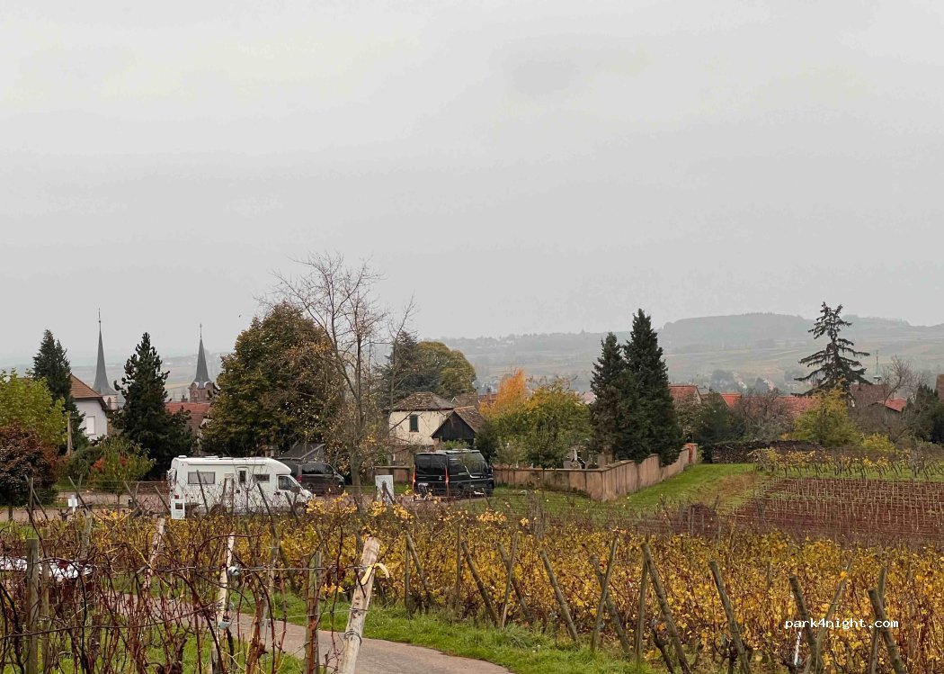 parkeerplaats bij een mooi dorpje. er staat nergens dat overnachten niet mag, wordt dan ook veel gedaan en mensen van de gemeente zwaaien vriendelijk naar je. picknick bankjes en een mooi uitzicht. goed te wandelen naar Mittelbergheim en Barr. rustig en rechte plaatsen. wij hebben hier een prima avond en nacht gehad.