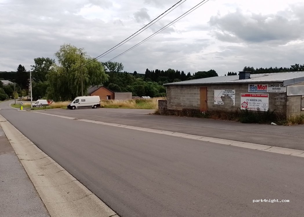 Kleine, licht hellende parkeerplaats voor een niet meer gebruikt voetbalveld in het mooie dorpje Naomé. 5 zitplaatsen. Zeer rustig 's nachts. Direct naast de prachtige mineralenwinkel Argonaut Stone. Geen dienst.