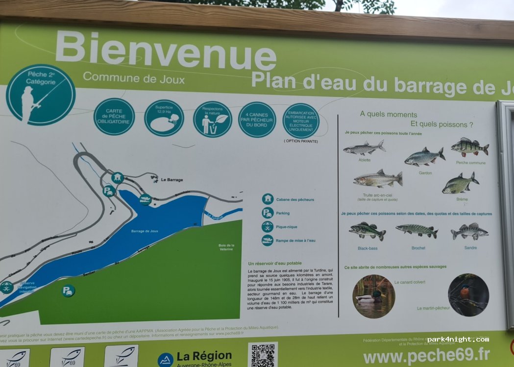 Parking sympa, plat en gravier. Environnement propre avec 3 tables de pic- nic Vue sur retenue d eau. Ballade proche. Route proche mais on l entend à peine. Parfait pour une nuit.