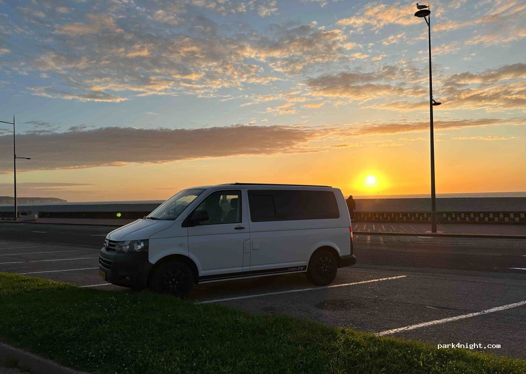 Beautiful, free, spacious, quiet place. We slept one night after arriving late in the evening on the ferry. 5 minutes walk to the town centre. There are car parks with 2m height restrictions near here. But on the front row, we found no height restrictions. Many bigger vans were in the paid Aire at the north east end of the beach.