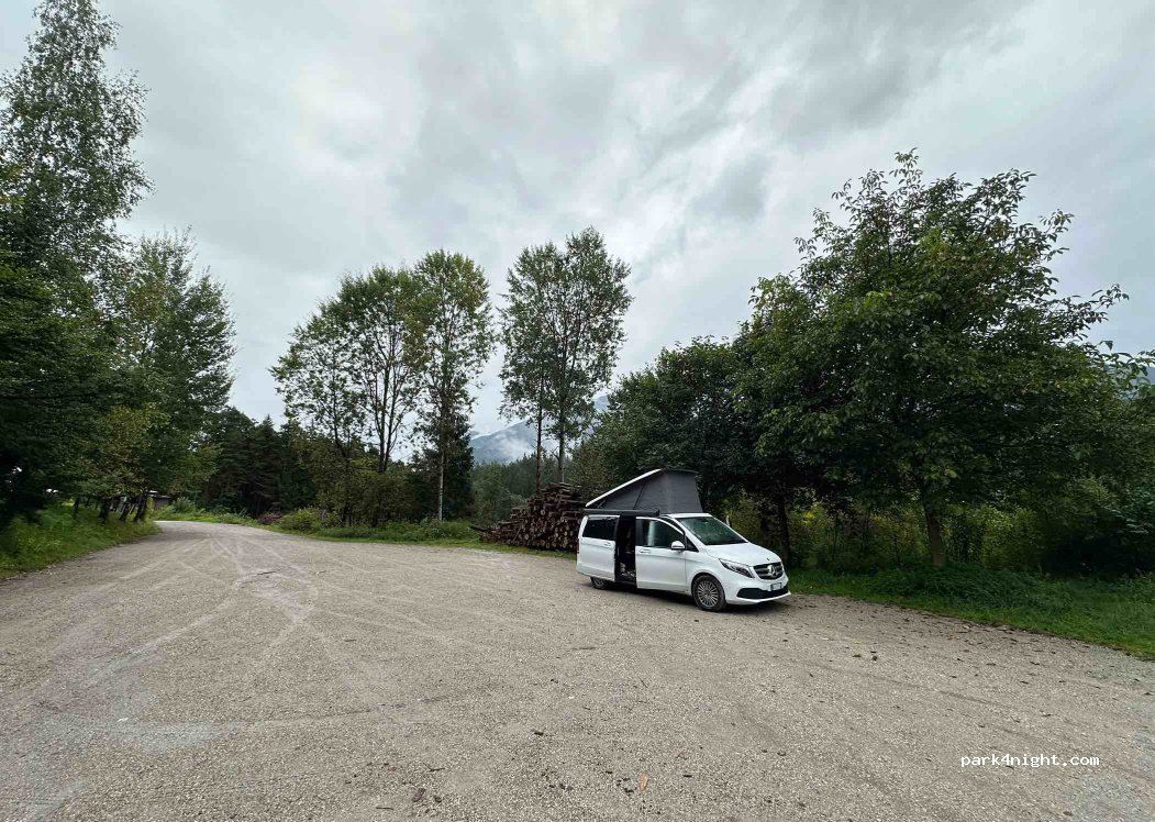 Grosser flacher Parkplatz in geschützter Lage, schöne Aussicht, ruhig. Gebühr: 6 € für 24 h (Juni 2024).