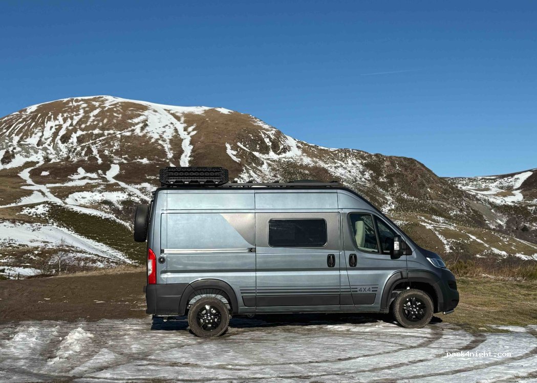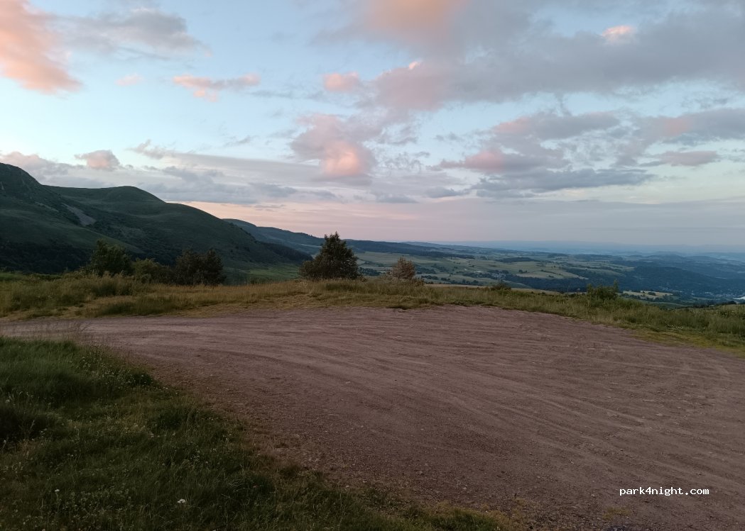 Right next to the large car park and helicopter area, but more out of the way. In the pastures, view of the cross of St. Robert on one side and Lake Chambon on the other. We also spent the night, a little wind in the VW roof tent but it works. The road is uncrowded.