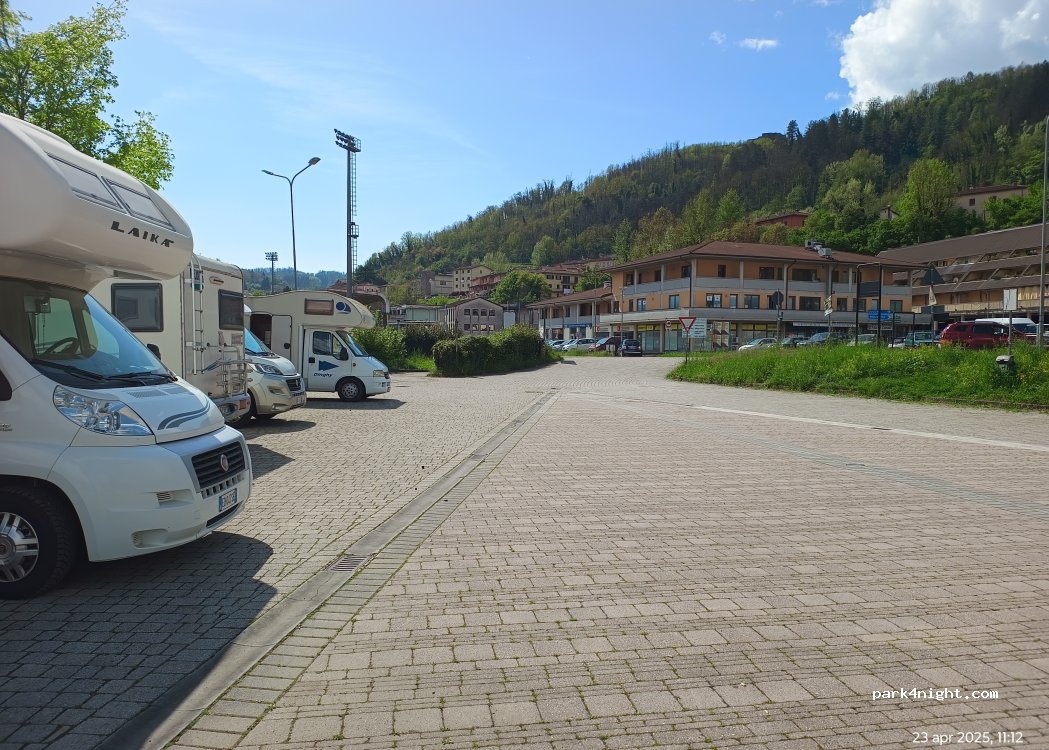 Ottimo per visitare il borgo raggiungibile a piedi in 15m, dista 950m. carico e scarico, non custodito, gratuito. Di fronte supermercato Conad.