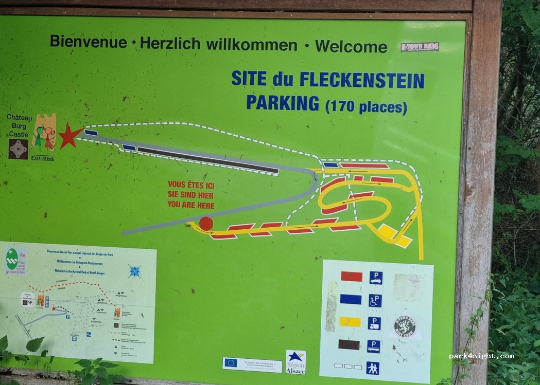 La voie du parking est en colimaçon et sens unique avec des zones en épi. Entrée en bas à droite avant le sens interdit. Sortie en haut. Donc beaucoup de places. La route pour monter au Fleckenstein est large. N’avons pas vu d’interdiction de nuit. 4G disponible. Toilettes à l’accueil du site.