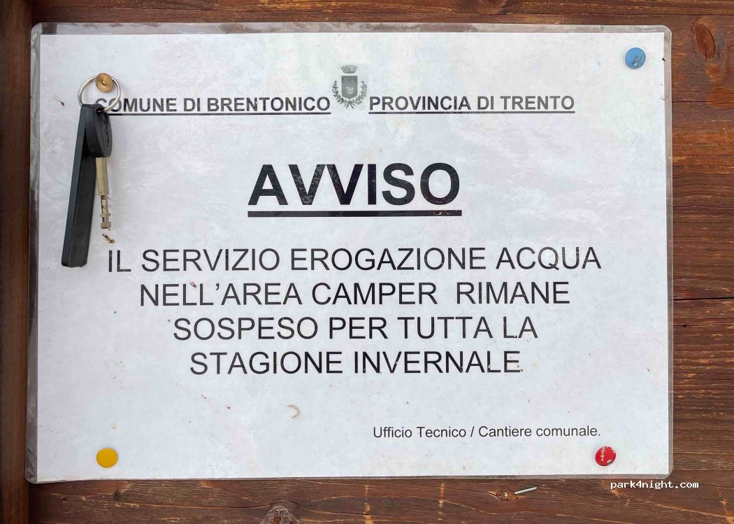 Excelente local com toda a estrutura necessária gratuita. Descarte de dejetos, abastecimento de água, lixeiras, somente a eletricidade que é cobrada(1,50€ por 12h). Acho que no verão podem ter algumas cobranças devido ao movimento mas não tenho certeza! Indico colocar o nome da cidade(Brentonico)no GPS e depois o endereço pois o GPS indica uma rota estreita e perigosa que não conseguimos passar!