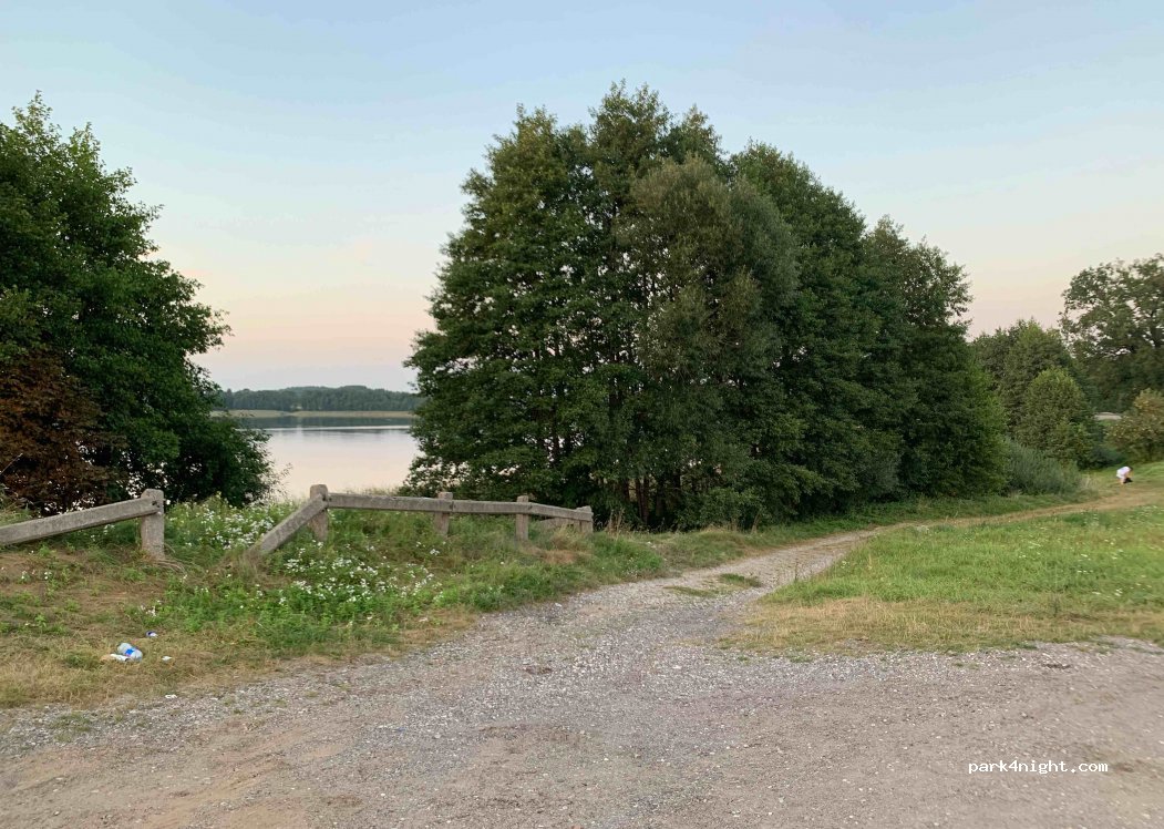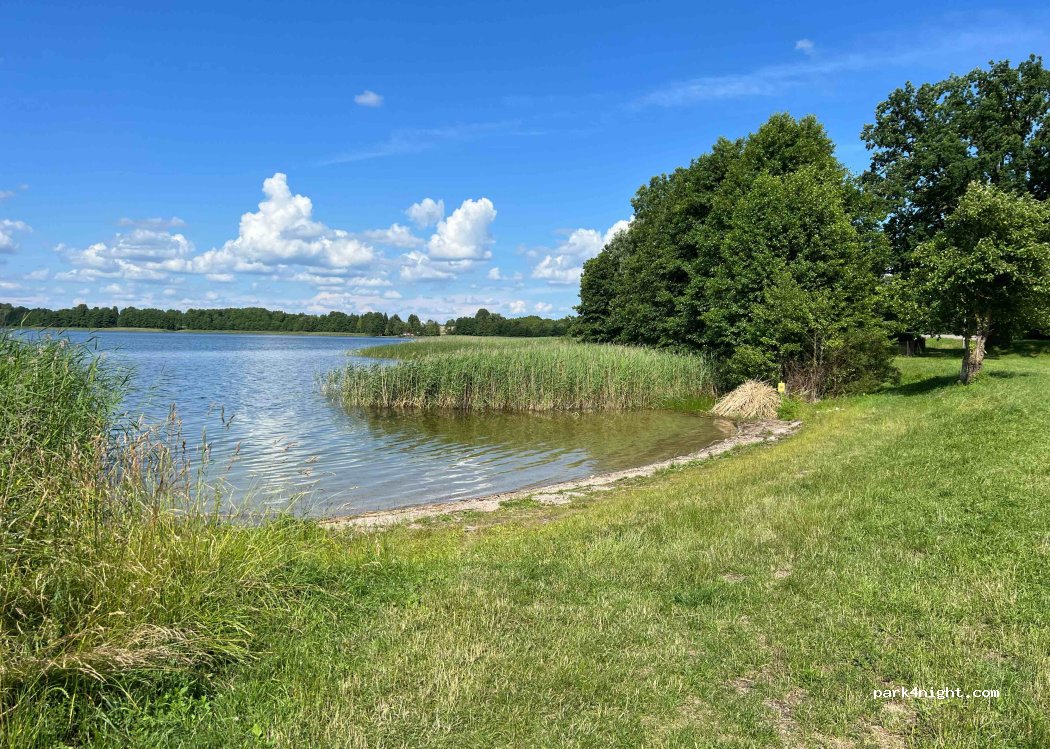 Une agréable place de parking à la campagne avec un lac propre à côté. Une petite plage de sable, idéale pour la baignade des enfants. Une route assez grande à côté, donc un peu de bruit de la circulation.