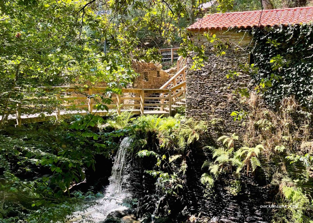 Lugar tranquilo al lado del río. Baño químico. Zona con mesas para comer. Pasarelas de madera para visitar molinos y pequeña catarata. Para aparcar, desnivelado, para una furgoneta, está bien.