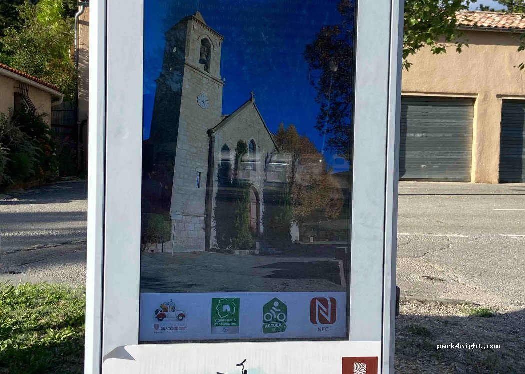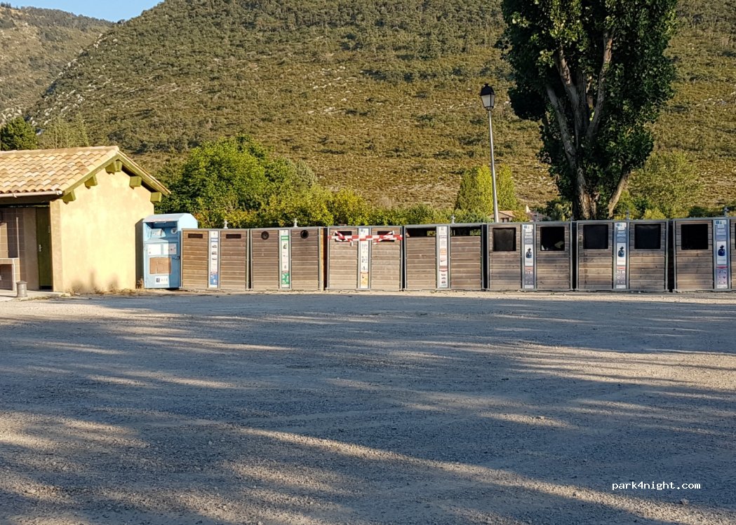 parking gratuit assez grand dans ce petit village. Très calme. Poubelles mais toilettes fermées.