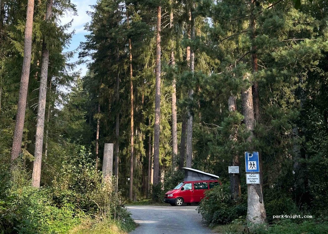 Ein schöner schattiger Parkplatz im Wald an einer wenig befahrenen Straße. Direkt gegenüber ist ein Badesee mit 2 Dixietoiletten. Leider gibt es weder auf dem Parkplatz noch am See Mülleimer. Bitte nehmt euren Müll wieder mit