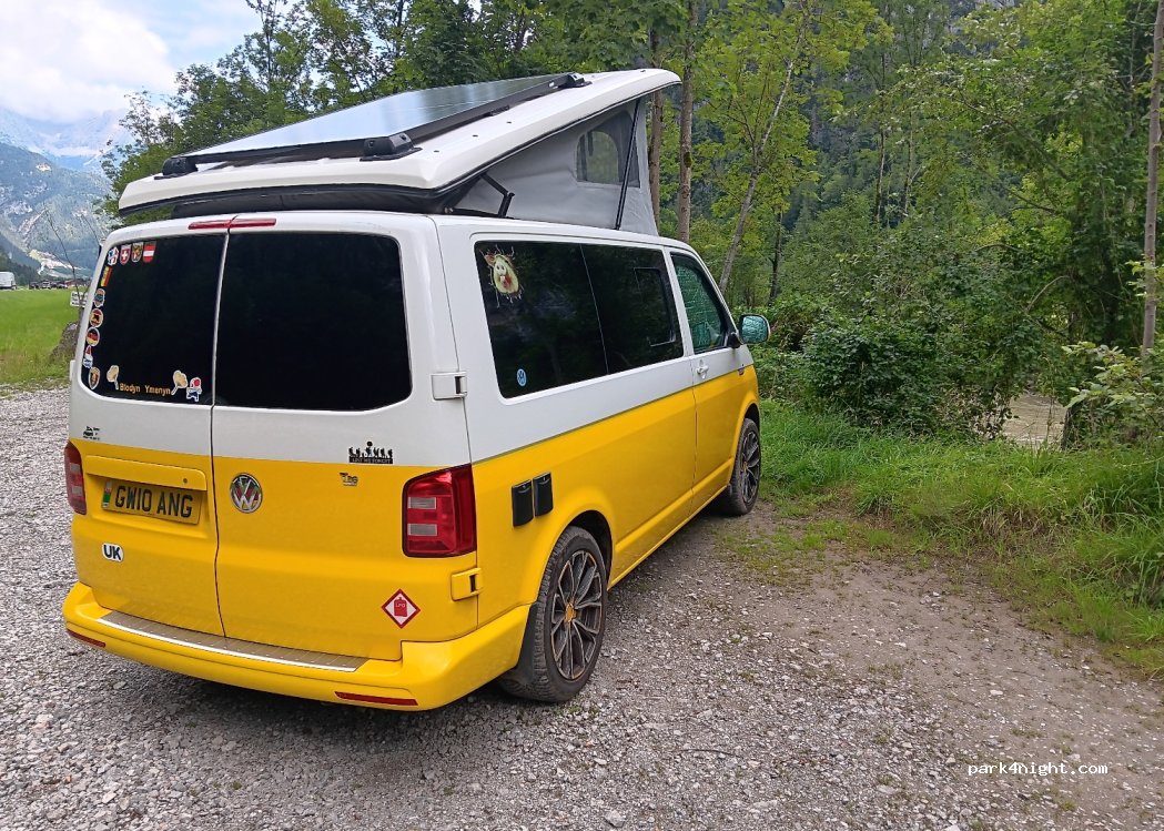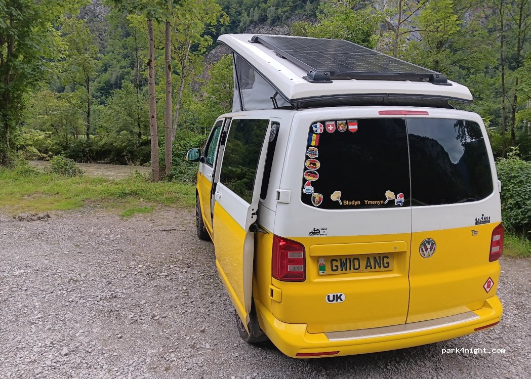 Nice spot by the river, right next to the main road. Starts to get loud by 6h as the traffic pics up, quiet after 23h. Need to park diagonally and not too close to the end so other cars can still turn. We stayed the night here in our van. There’s a bridge over the river to the cabin further ahead.