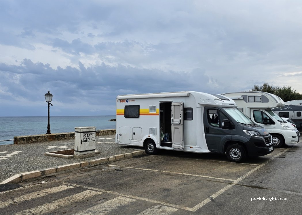 parcheggio gratuito tranquillo e silenzioso per dormire di fronte al mare in questa stagione. stalli per auto ma con la coda del camper sull'aiuola è possibile parcheggiare anche camper di 7 metri. È presente una fontanella per l'acqua con l'attacco per agganciare un tubo. non è presente nessun divieto per i camper.