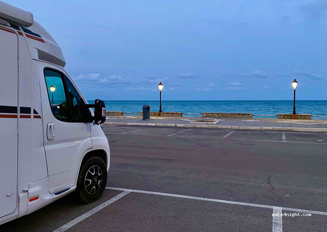 Großer öffentlicher Parkplatz kostenlos, hell beleuchtet. Etwas Traffic aber gut zum Übernachten ca eine Woche im Winter problemlos. Tolle Sonnenaufgänge über dem Meer mit Sicht bis auf die albanischen Berge, bei entsprechender Wetterlage.