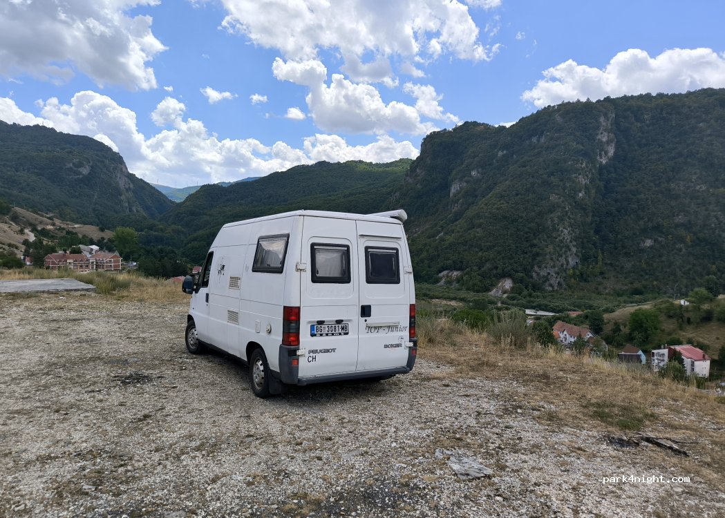Kiesplatz mit schöner Aussicht auf Savnik. Geeignet für einen Zwischenstop und zum Übernachten. Einwenig weiter unten neben dem Polizeiposten, gibt es einen Brunnen zum Wasser auffüllen.